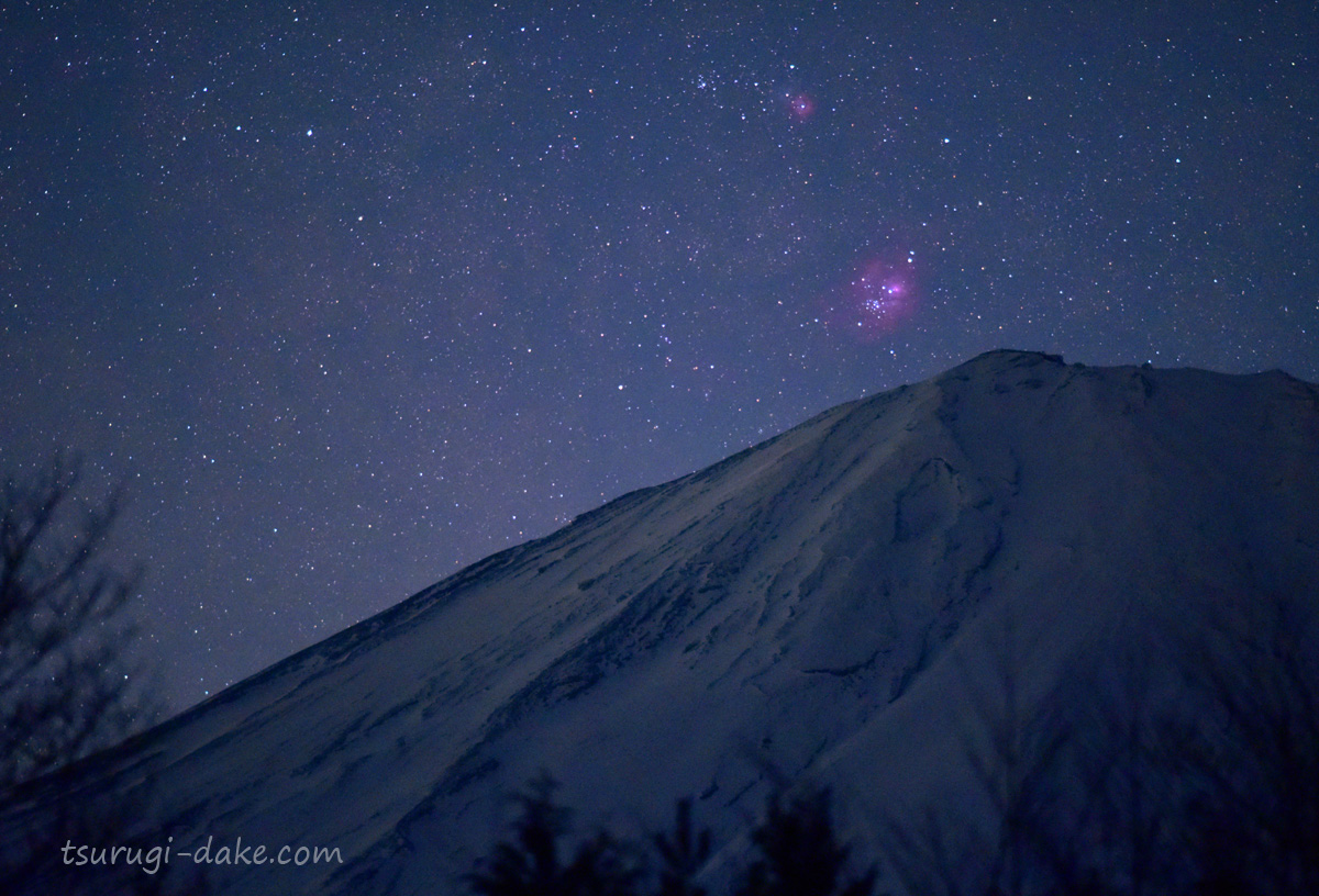 | 2019年3月 山梨県 富士山から干潟星雲(M8)が昇る 望遠星景(2秒露出を連写した1コマ) |