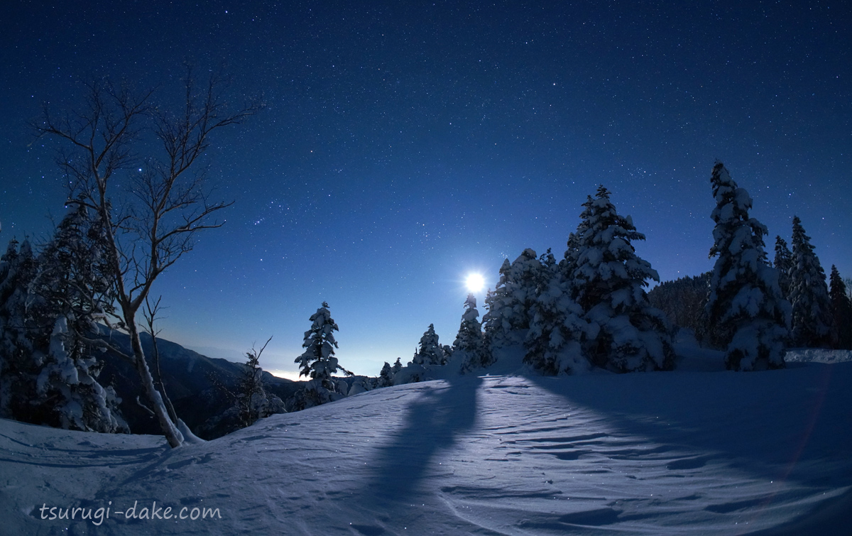 | 2021年2月 長野県 降雪直後に晴れてきた時間 真っ白な雪面に月の影が伸びる |