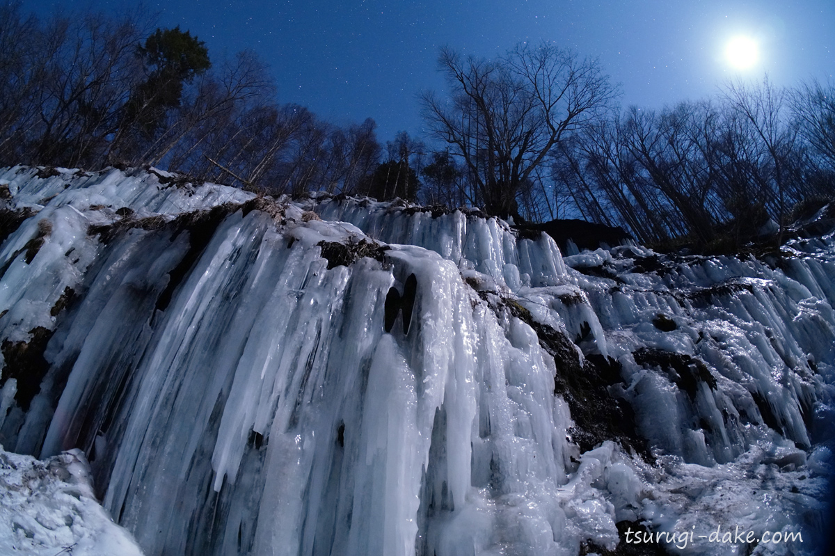 | 2021年2月 長野県 上弦すぎの月明り 湧水が氷結した谷あいを見上げている |