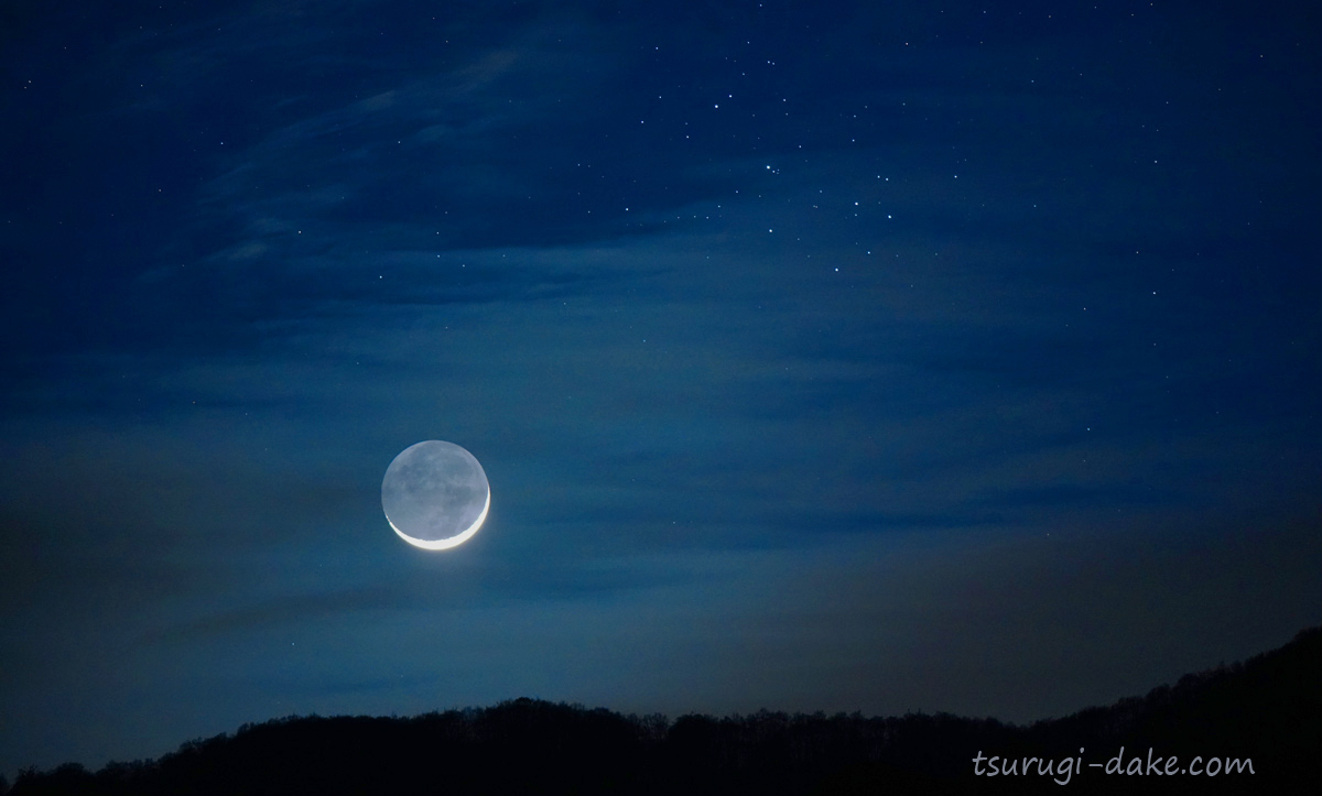 | 2023年4月 岐阜県 宵時の細月 ちょうどスバル(M45)と一緒に里山に掛かる |