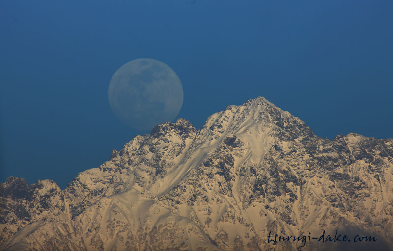 満月前の月がまだ残照あたる剱岳から昇ってくる。