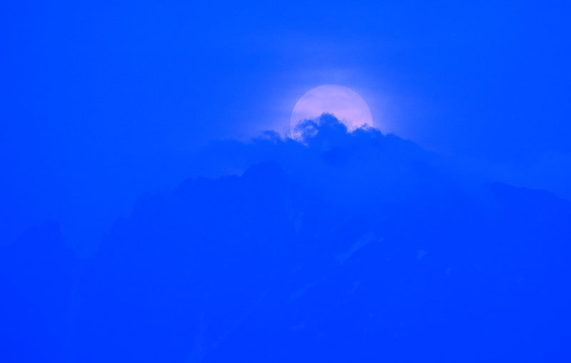 満月が剱岳から出てくるところ・・・山頂付近に掛かった雲で遮られる
