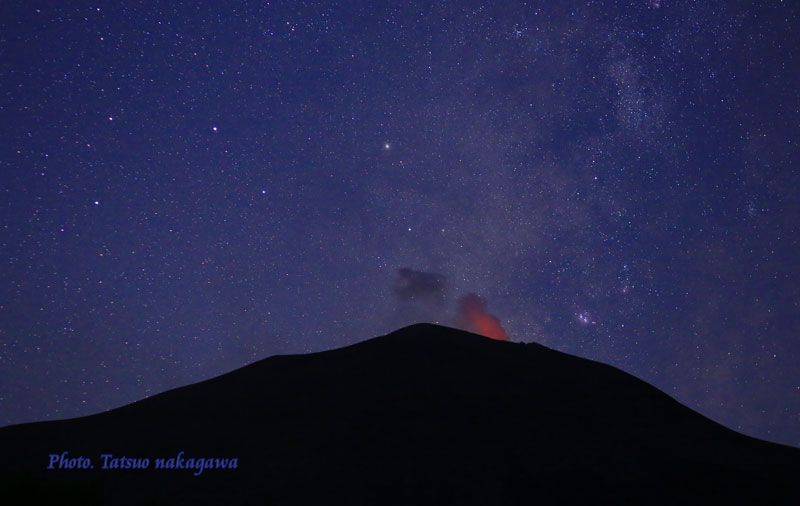 晴れたタイミングに天の川 火口の噴煙を火映が照らす