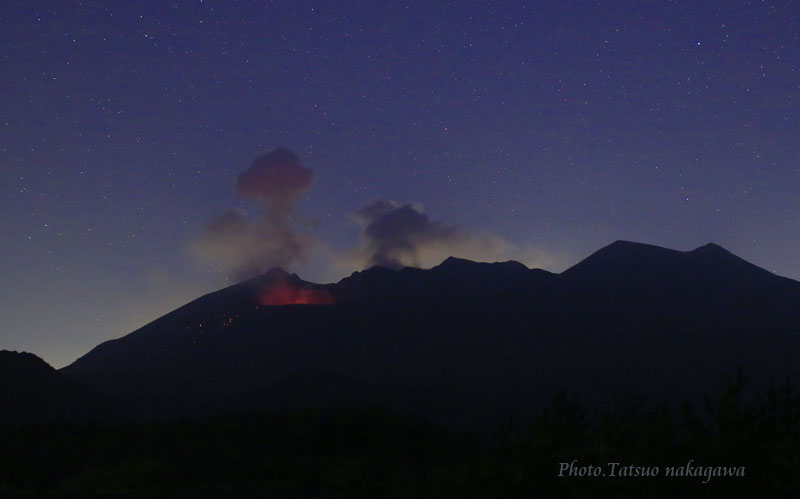 こちらも噴煙も控えめであったが夜明け前に小噴火