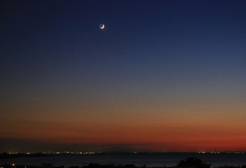 夕暮れの三日月 夕暮れ色に染まる 秋は一日が短くあっという間に陽が沈む