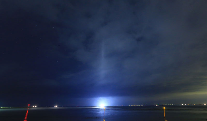 低空にたまった雲 氷点下だと 富山湾の漁り火に光柱