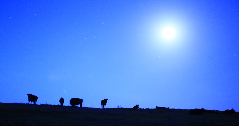 夜明け前 残月のこる牧場には終日のんびりのウシたち
