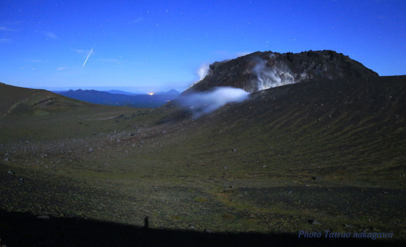 地球の大気に流星、地球から噴煙、地上に自分の影