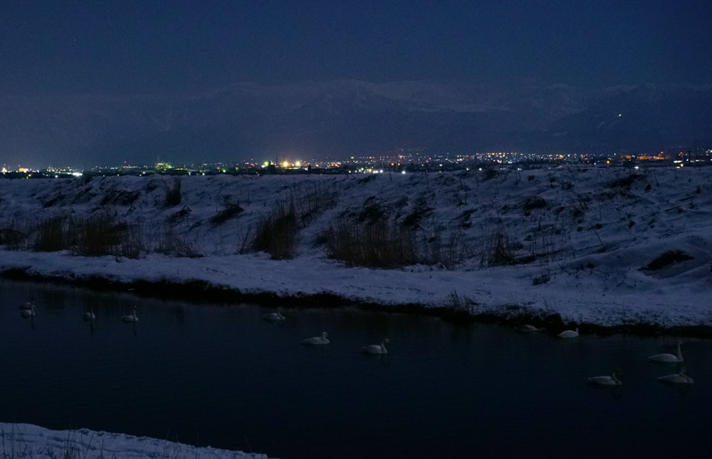 月明かりでうっすら立山連峰 ハクチョウは夜でも寝ずに川面を泳ぎ回る