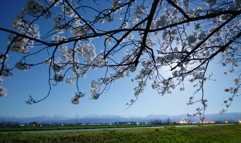 満月後の立待月がサクラと剱・立山連峰を照らす