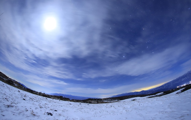 雪景色に星空 雲はちょっと多すぎ