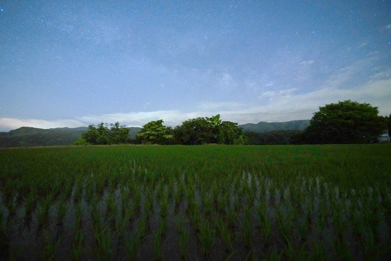 晩生のイネも生育して見える田んぼの水面もちょっと