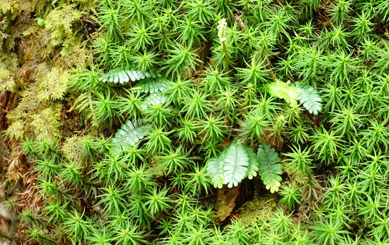 内陸の標高2000mでもちょうど霧があるためか苔に覆われる森のなか