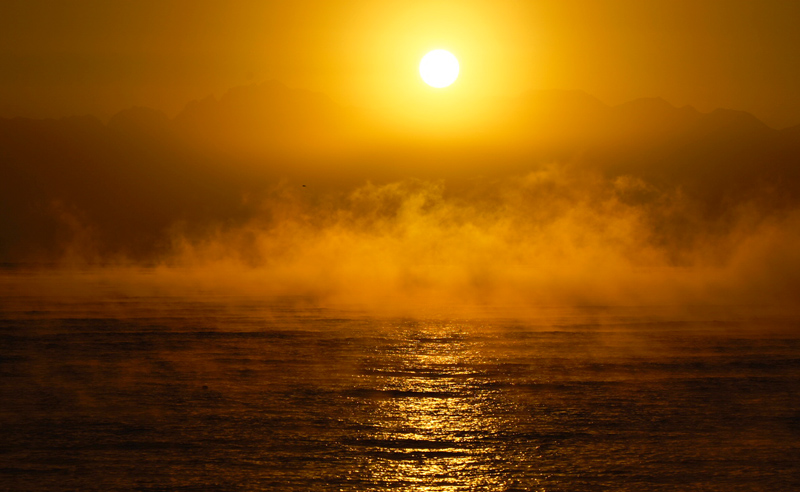 富山湾で冷え込んだ日の出頃にみられる気嵐