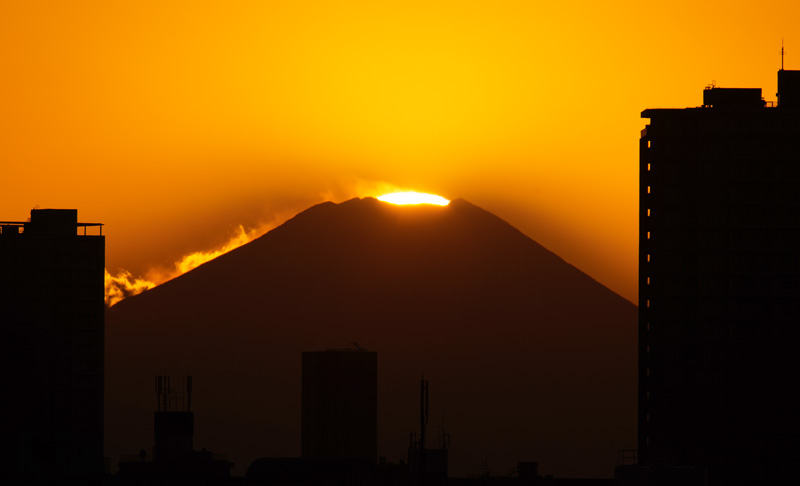 富士山から100km離れて見る夕日