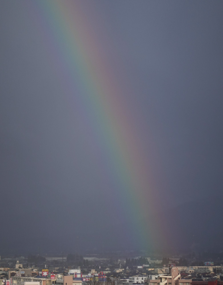 夕方近くの虹は太陽高度が低空であるため虹の立ち上がり角度が大きい