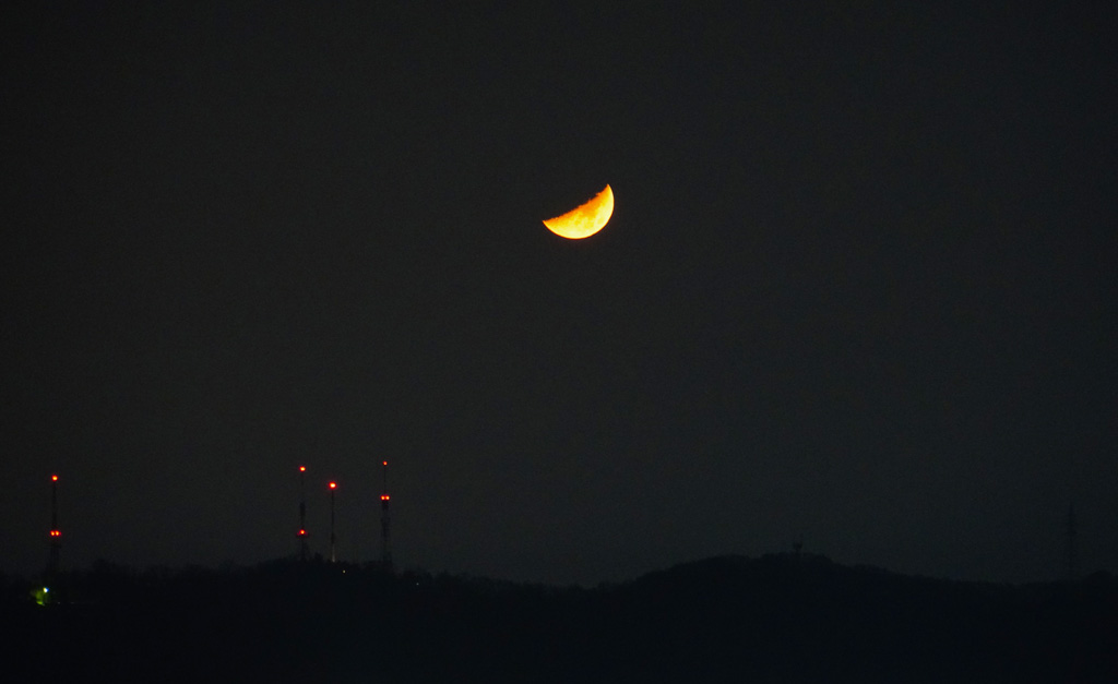 上弦前の月が未明に沈む かすみに覆われる日も増えてきた