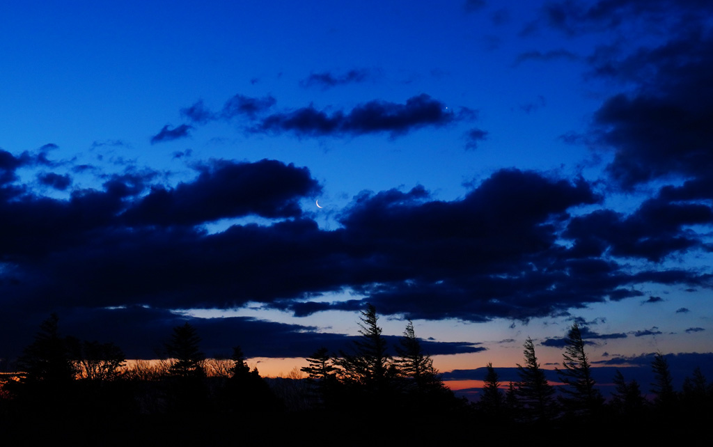 月齢27の月と金星が雲間からみえる。下界はかすみ空でも標高で透明度が上がる