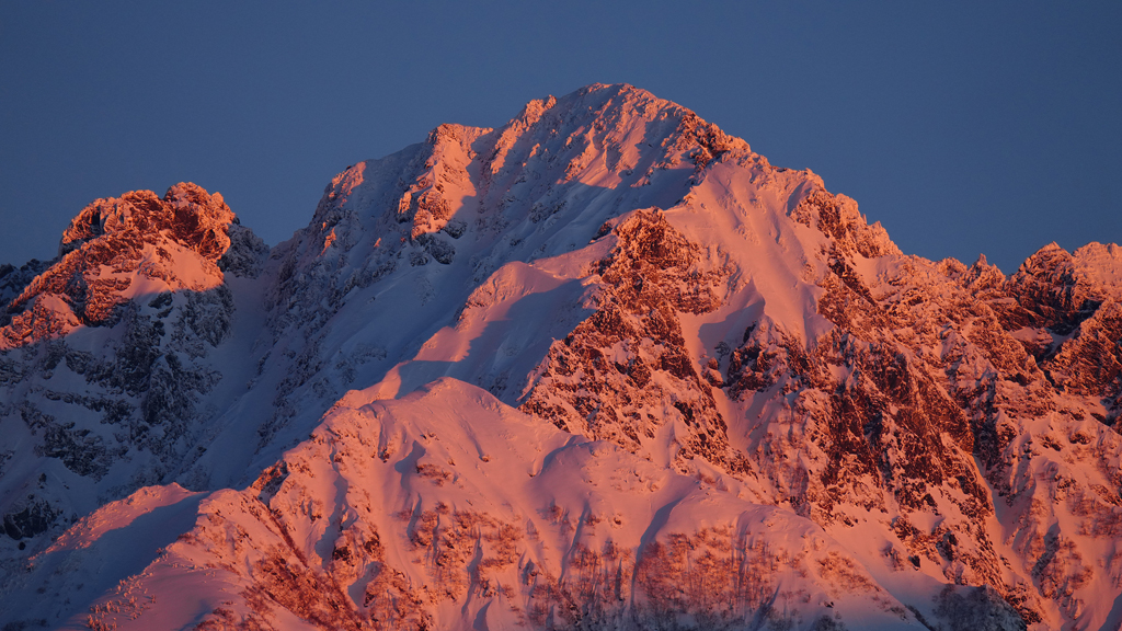 終日空の透明度も良く、前日降雪もあったためとびっきりの夕焼け剱岳