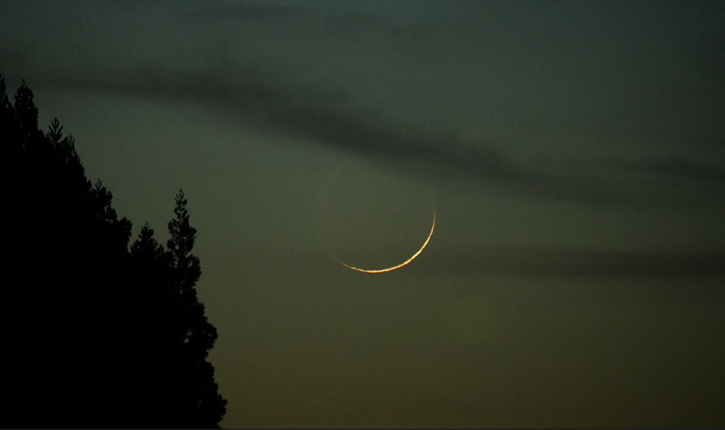 月齢1の細月に ホタルの光が通過