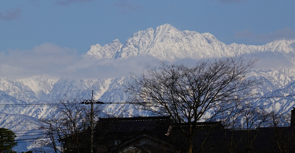 富山市郊外からの剱岳 降雪があったばかりで真っ白 彼岸後半でも寒い