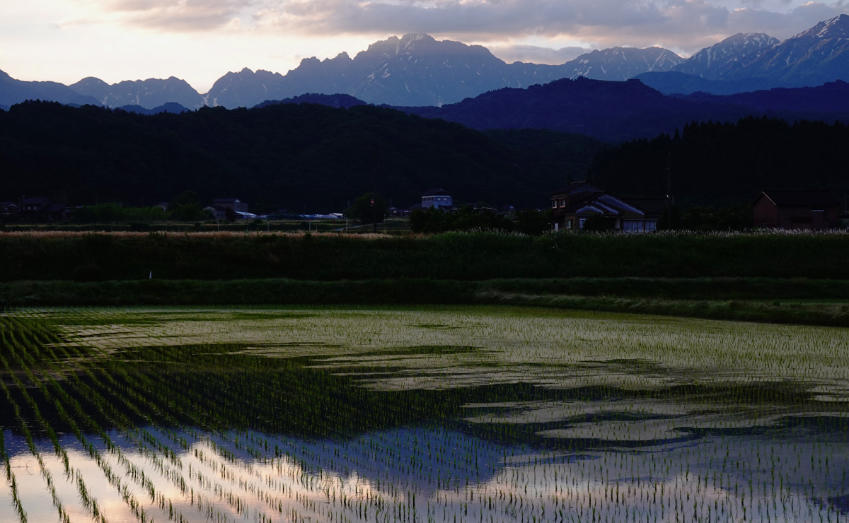 田んぼに映る朝方の剱岳 すでに半分が水草で覆われている