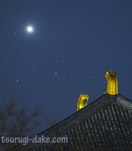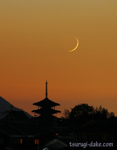 金色の東大寺大仏殿と金星 柿色の夕焼けの月と法隆寺 |